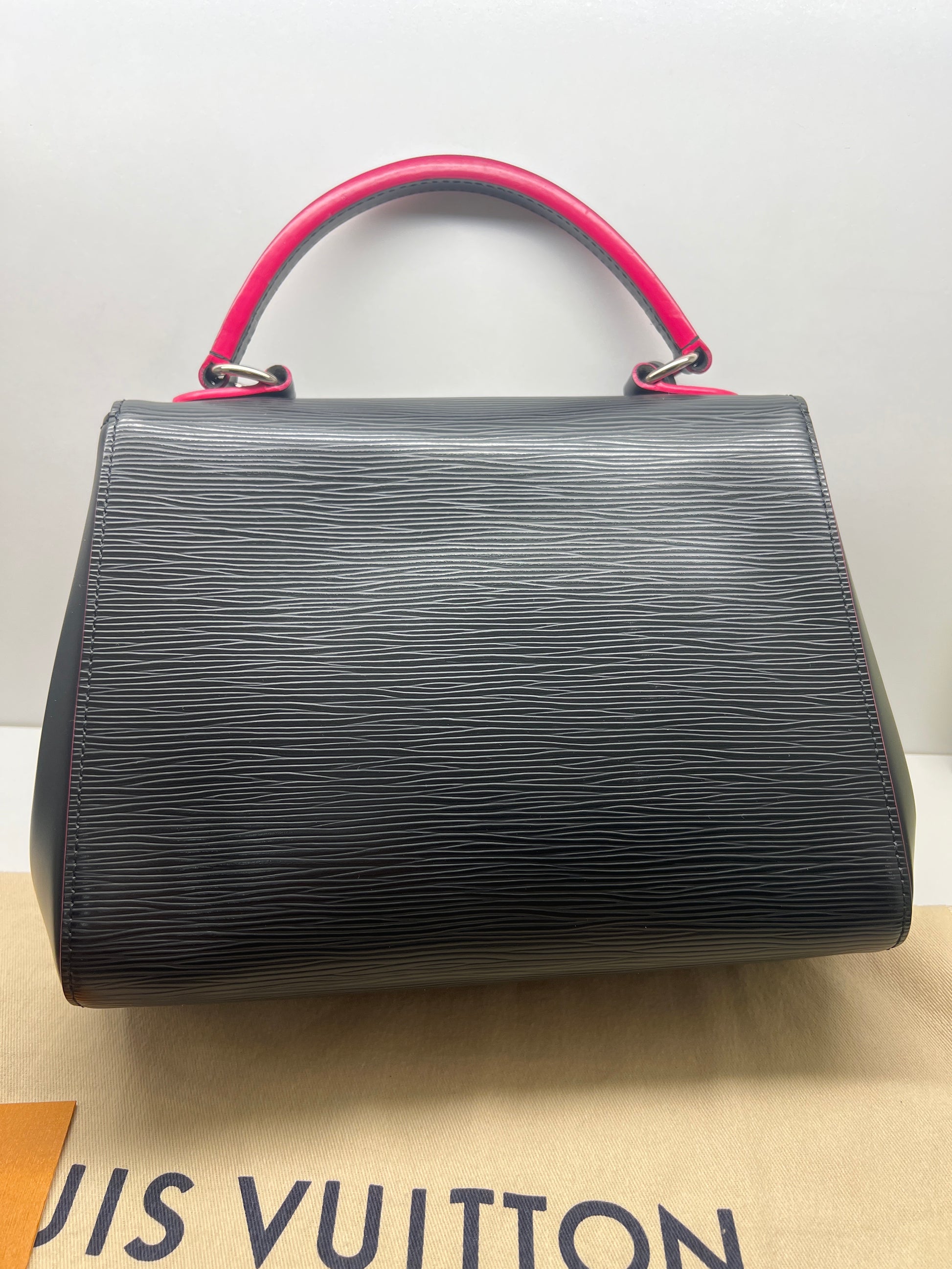 Borsa Louis Vuitton in pelle Epi nera con dettagli fucsia, un modello sofisticato e ricercato che unisce eleganza e modernità. La silhouette strutturata, impreziosita dalle finiture in metallo argentato, la rende perfetta sia per il giorno che per la sera.