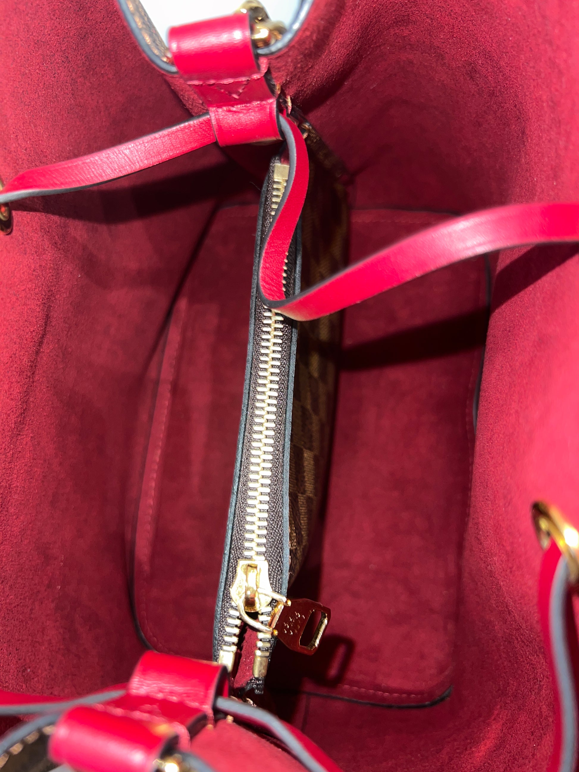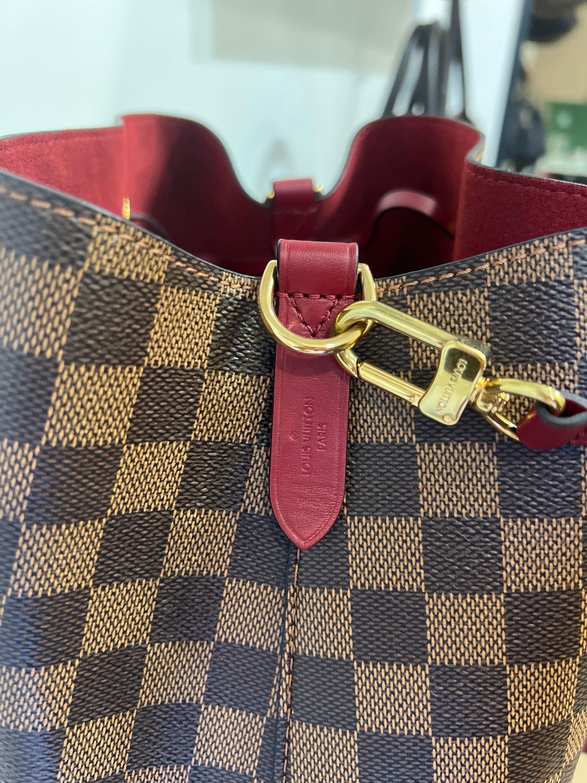 Borsa Louis Vuitton modello NéoNoé in tela Damier Ebene con dettagli in pelle bordeaux. Un secchiello moderno e raffinato, reinterpretazione dell’iconico modello creato nel 1932, pensato per unire praticità e stile senza tempo.